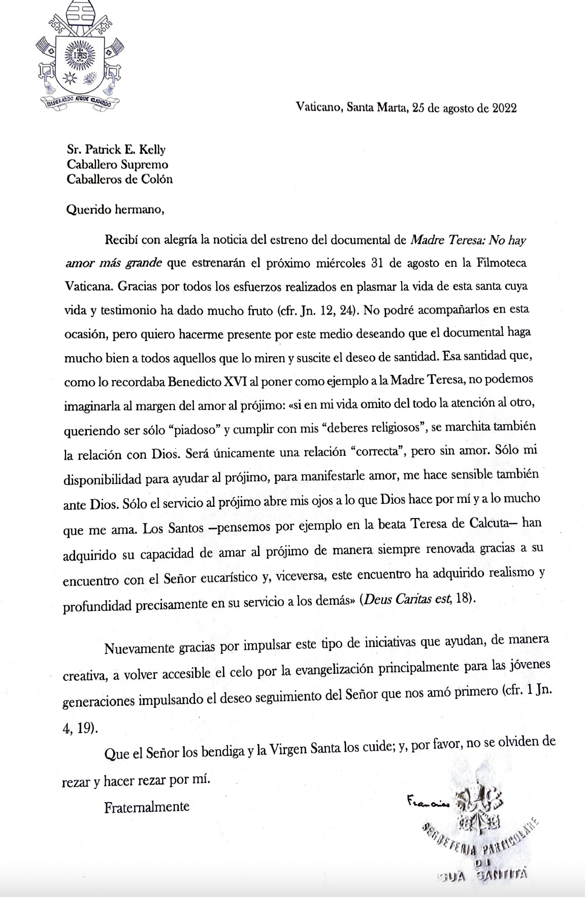 Personal Letter from Pope Francis to Supreme Knight Patrick Kelly